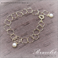 ユニークデザインのSVゴールドカラーブレスレット。チェーンの中間と端にベビーサイズのあこや真珠をぶら下げました。手首にころんと転がる小さなイエローパールは遊び心を忘れない素敵なレディを装います。サイズは全長18cmでどこにでもひっかけられるデザインです |